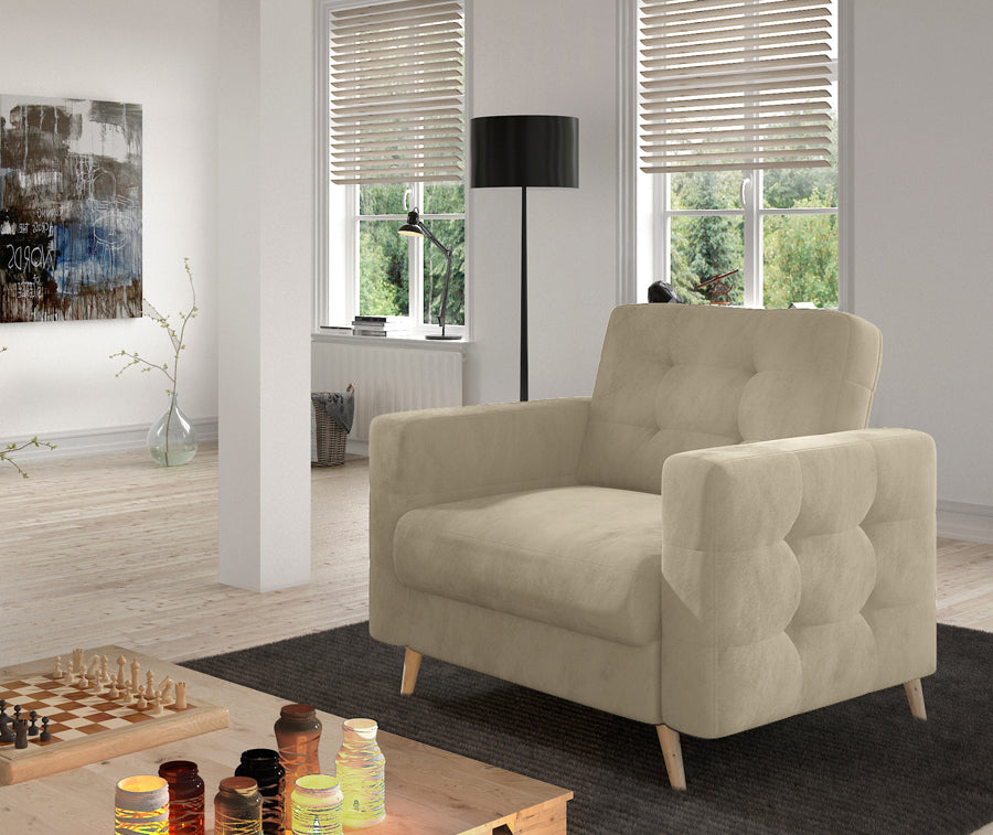 Fotel Asgard w klasycznym designie wzbogaci każdą przestrzeń w domowym zaciszu. Fotel posiada głębokie, gładkie siedzisko i ozdobne pikowania na bokach oraz na oparciu mebla. Całość prezentuje się niespotykanie lekko, dzięki drewnianym, toczonym nogom, które dodają eleganckiego wymiaru. Fotel ten, w zależności od preferencji, można postawić zarówno w sypialni, jak i salonie czy gabinecie. Plusem tego modelu z kolekcji mebli tapicerowanych ELTAP jest także obszerna poducha w siedzisku wypełniona pianką T30, która zapewnia wygodne miejsce do siedzenia i relaksu. Ten rodzaj pianki tapicerskiej ma doskonałą twardość, idealną sprężystość, a także dużą gęstość. W siedzisku mebla zastosowano również sprężynę falistą, a ta charakteryzuje się zwiększoną odpornością na zagniecenia – w związku z tym siedzisko jest stabilne. Położona na sprężynach gąbka nie będzie się wygniatała, a także zyska na trwałości.