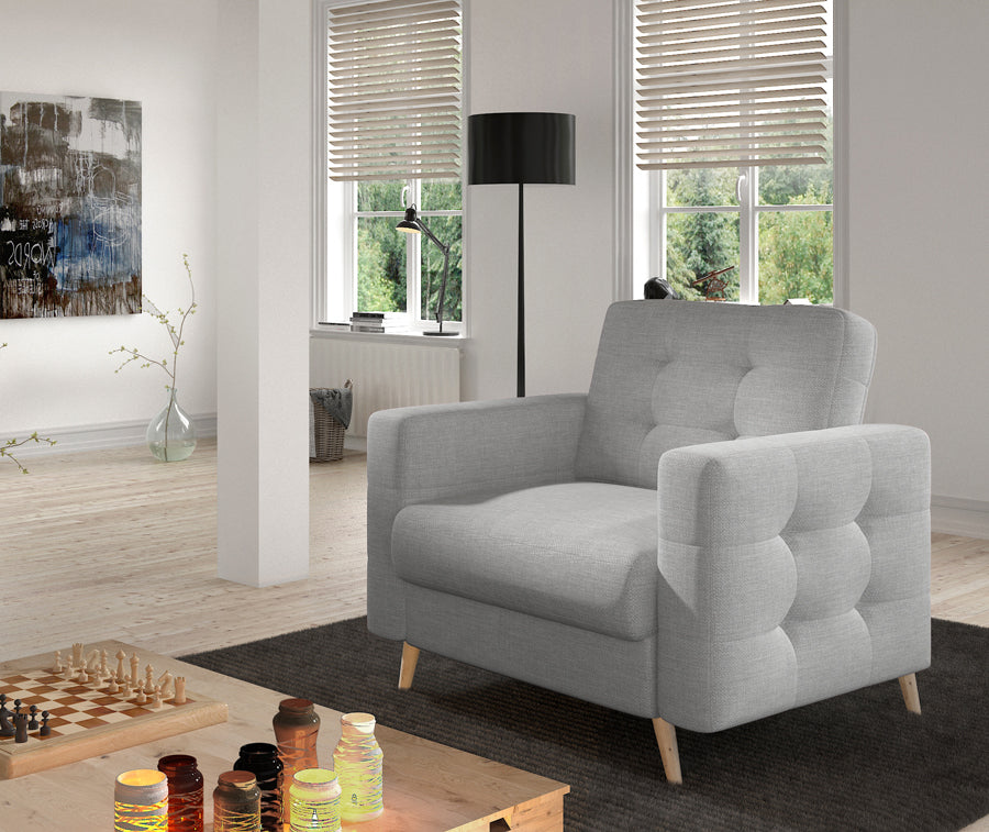 Fotel Asgard w klasycznym designie wzbogaci każdą przestrzeń w domowym zaciszu. Fotel posiada głębokie, gładkie siedzisko i ozdobne pikowania na bokach oraz na oparciu mebla. Całość prezentuje się niespotykanie lekko, dzięki drewnianym, toczonym nogom, które dodają eleganckiego wymiaru. Fotel ten, w zależności od preferencji, można postawić zarówno w sypialni, jak i salonie czy gabinecie. Plusem tego modelu z kolekcji mebli tapicerowanych ELTAP jest także obszerna poducha w siedzisku wypełniona pianką T30, która zapewnia wygodne miejsce do siedzenia i relaksu. Ten rodzaj pianki tapicerskiej ma doskonałą twardość, idealną sprężystość, a także dużą gęstość. W siedzisku mebla zastosowano również sprężynę falistą, a ta charakteryzuje się zwiększoną odpornością na zagniecenia – w związku z tym siedzisko jest stabilne. Położona na sprężynach gąbka nie będzie się wygniatała, a także zyska na trwałości.