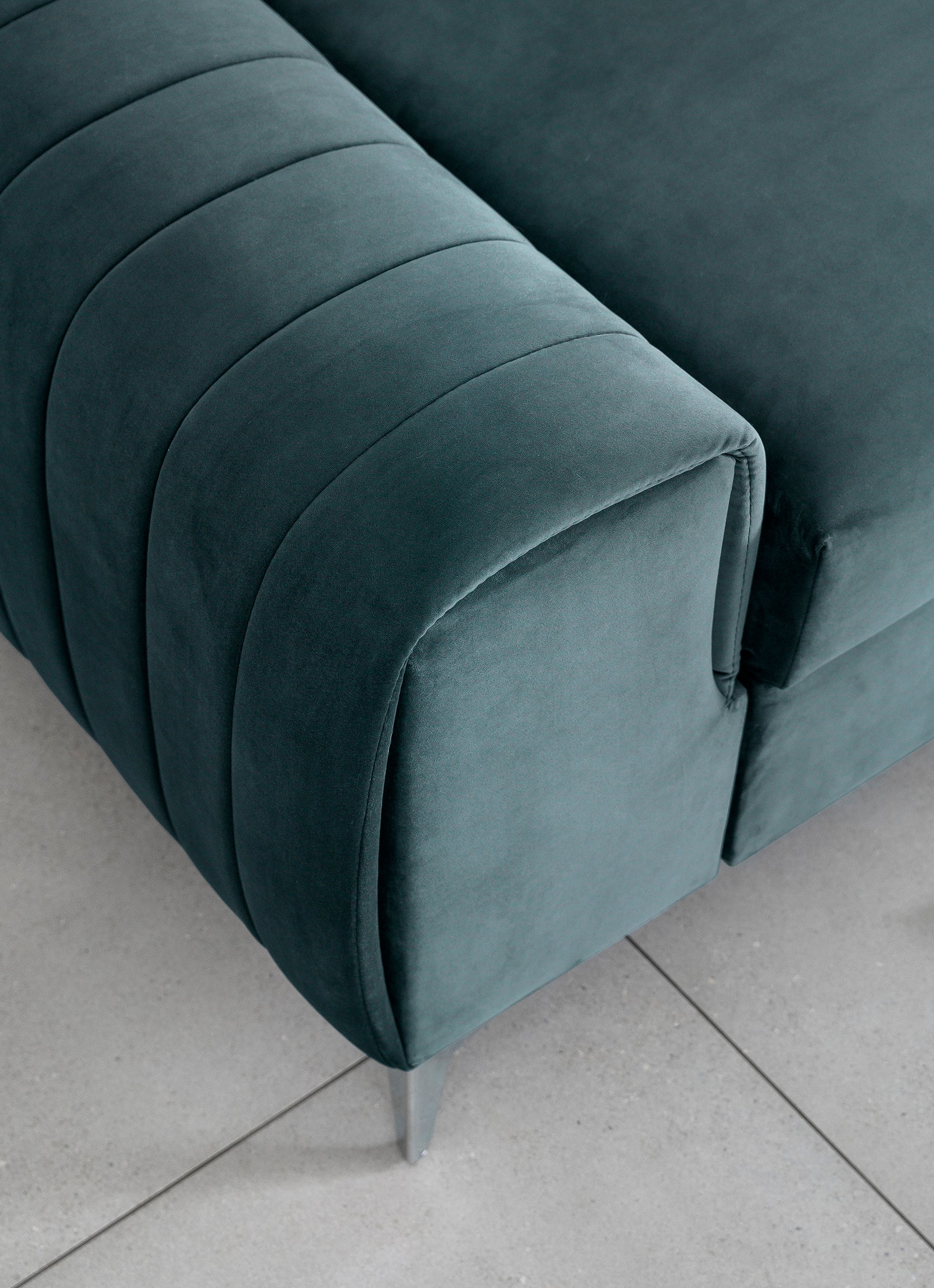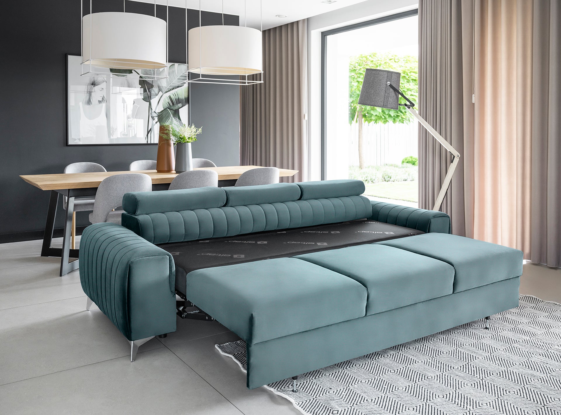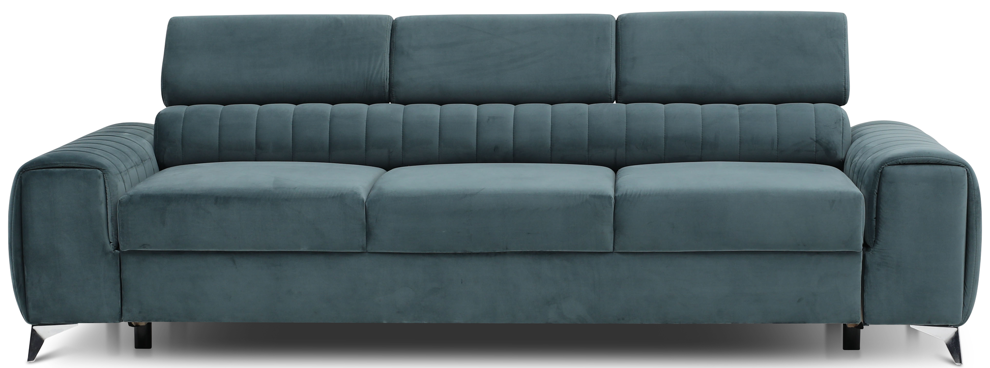 Kanapa Laurence ma solidną konstrukcję i drewnianą ramę, która opiera się na zwężających się, ukośnych, metalowych, chromowanych nogach, co zapewnia efekt glamour oraz klasycznego piękna z nutką nowoczesności. Otulona eleganckimi tkaninami z kolekcji ELTAP rozkładana sofa jest wypełniona piankami HR i T30, a także wspierana przez solidne sprężyny faliste typu B, które zapewniają optymalne poczucie komfortu. Kanapa Laurence wprowadza do wnętrza lekkość i elegancję. Klasyczną bryłę mebla przełamują przeszycia i wyraźnie podkreślony podział mebla na trzy miejsca w siedzisku. Wszystko to sprawia, że nasz mebel tapicerowany wygląda stylowo i elegancko bez względu na to, gdzie go postawisz. Z pewnością stanie się hitem zarówno wśród odwiedzających dom przyjaciół, jak i rodziny. Kanapa Laurence to idealny wybór do małych pomieszczeń, gdzie nie ma opcji wstawienia narożnika, ponieważ jej wymiary to: 261x97x75 centymetrów. Wysokość nóżek pozwala na sprzątanie pod kanapą nowoczesnymi robotami sprzątającymi, ponieważ wynosi 9 cm. Kolejnym świetnym pomysłem zastosowanym w kanapie Laurence jest funkcja trzech ruchomych zagłówków. Dzięki temu zabiegowi można komfortowo wypoczywać i nie martwić się o niewygodne ułożenie ciała. Ta kanapa z funkcją spania prezentuje się elegancko i estetycznie. Jej nowoczesny wygląd wprowadzi wspaniałe wrażenie i doda stylu Twojej przestrzeni życiowej.