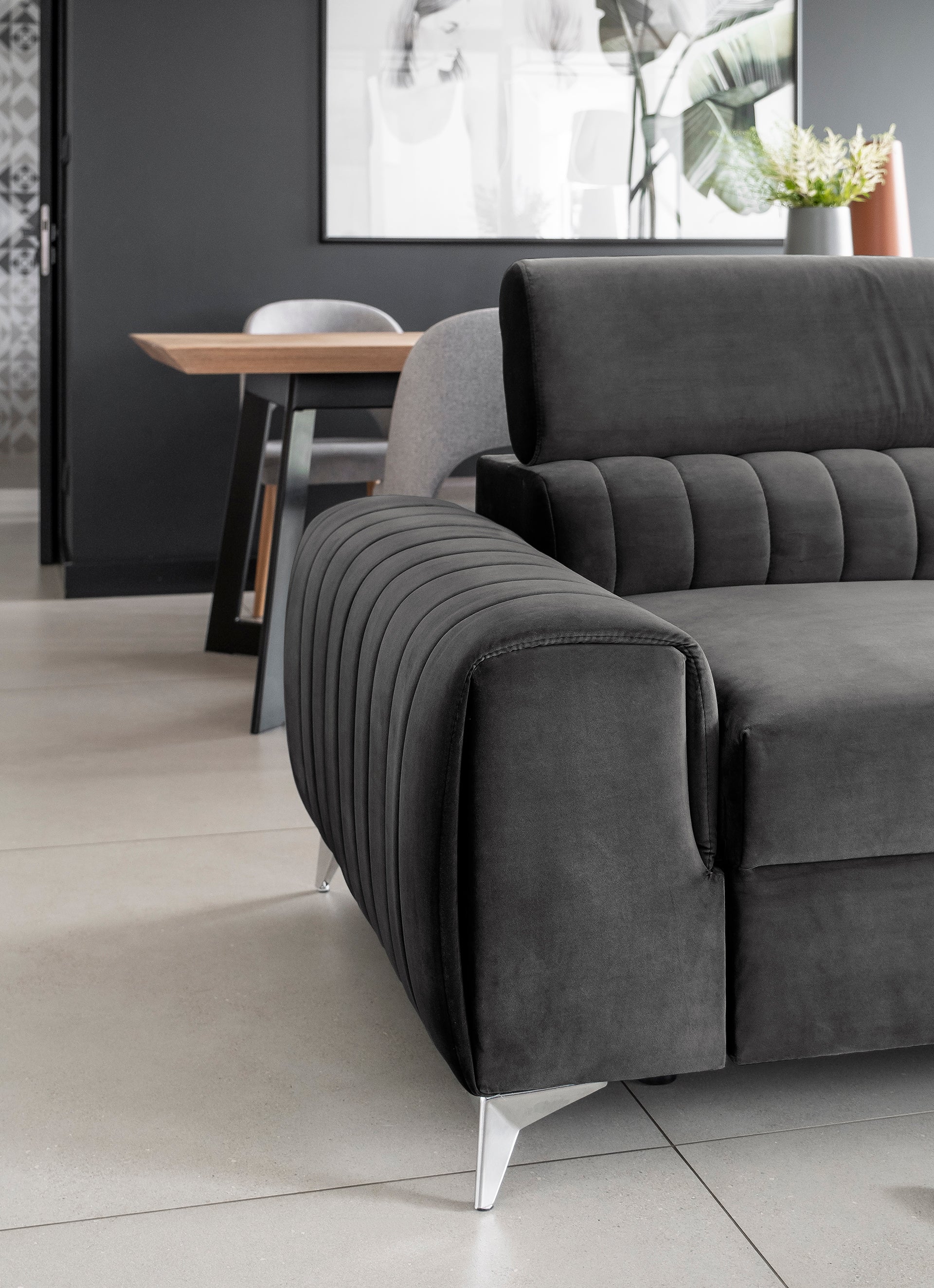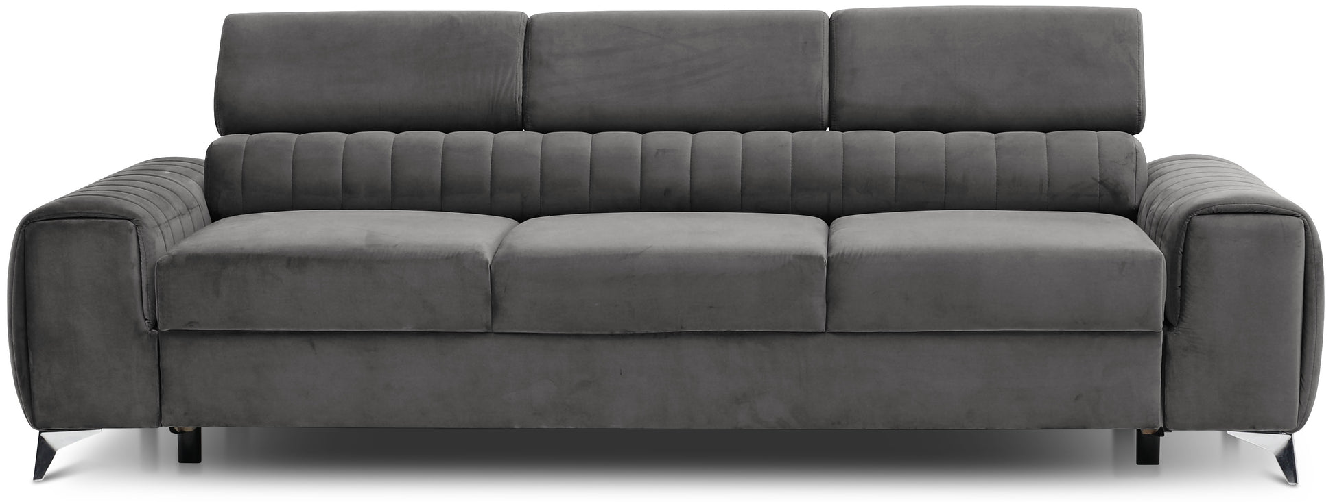 Kanapa Laurence ma solidną konstrukcję i drewnianą ramę, która opiera się na zwężających się, ukośnych, metalowych, chromowanych nogach, co zapewnia efekt glamour oraz klasycznego piękna z nutką nowoczesności. Otulona eleganckimi tkaninami z kolekcji ELTAP rozkładana sofa jest wypełniona piankami HR i T30, a także wspierana przez solidne sprężyny faliste typu B, które zapewniają optymalne poczucie komfortu. Kanapa Laurence wprowadza do wnętrza lekkość i elegancję. Klasyczną bryłę mebla przełamują przeszycia i wyraźnie podkreślony podział mebla na trzy miejsca w siedzisku. Wszystko to sprawia, że nasz mebel tapicerowany wygląda stylowo i elegancko bez względu na to, gdzie go postawisz. Z pewnością stanie się hitem zarówno wśród odwiedzających dom przyjaciół, jak i rodziny. Kanapa Laurence to idealny wybór do małych pomieszczeń, gdzie nie ma opcji wstawienia narożnika, ponieważ jej wymiary to: 261x97x75 centymetrów. Wysokość nóżek pozwala na sprzątanie pod kanapą nowoczesnymi robotami sprzątającymi, ponieważ wynosi 9 cm. Kolejnym świetnym pomysłem zastosowanym w kanapie Laurence jest funkcja trzech ruchomych zagłówków. Dzięki temu zabiegowi można komfortowo wypoczywać i nie martwić się o niewygodne ułożenie ciała. Ta kanapa z funkcją spania prezentuje się elegancko i estetycznie. Jej nowoczesny wygląd wprowadzi wspaniałe wrażenie i doda stylu Twojej przestrzeni życiowej.