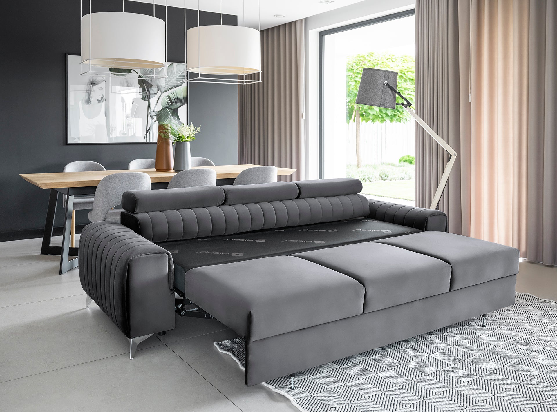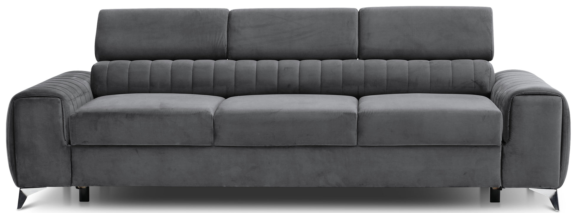 Kanapa Laurence ma solidną konstrukcję i drewnianą ramę, która opiera się na zwężających się, ukośnych, metalowych, chromowanych nogach, co zapewnia efekt glamour oraz klasycznego piękna z nutką nowoczesności. Otulona eleganckimi tkaninami z kolekcji ELTAP rozkładana sofa jest wypełniona piankami HR i T30, a także wspierana przez solidne sprężyny faliste typu B, które zapewniają optymalne poczucie komfortu. Kanapa Laurence wprowadza do wnętrza lekkość i elegancję. Klasyczną bryłę mebla przełamują przeszycia i wyraźnie podkreślony podział mebla na trzy miejsca w siedzisku. Wszystko to sprawia, że nasz mebel tapicerowany wygląda stylowo i elegancko bez względu na to, gdzie go postawisz. Z pewnością stanie się hitem zarówno wśród odwiedzających dom przyjaciół, jak i rodziny. Kanapa Laurence to idealny wybór do małych pomieszczeń, gdzie nie ma opcji wstawienia narożnika, ponieważ jej wymiary to: 261x97x75 centymetrów. Wysokość nóżek pozwala na sprzątanie pod kanapą nowoczesnymi robotami sprzątającymi, ponieważ wynosi 9 cm. Kolejnym świetnym pomysłem zastosowanym w kanapie Laurence jest funkcja trzech ruchomych zagłówków. Dzięki temu zabiegowi można komfortowo wypoczywać i nie martwić się o niewygodne ułożenie ciała. Ta kanapa z funkcją spania prezentuje się elegancko i estetycznie. Jej nowoczesny wygląd wprowadzi wspaniałe wrażenie i doda stylu Twojej przestrzeni życiowej.