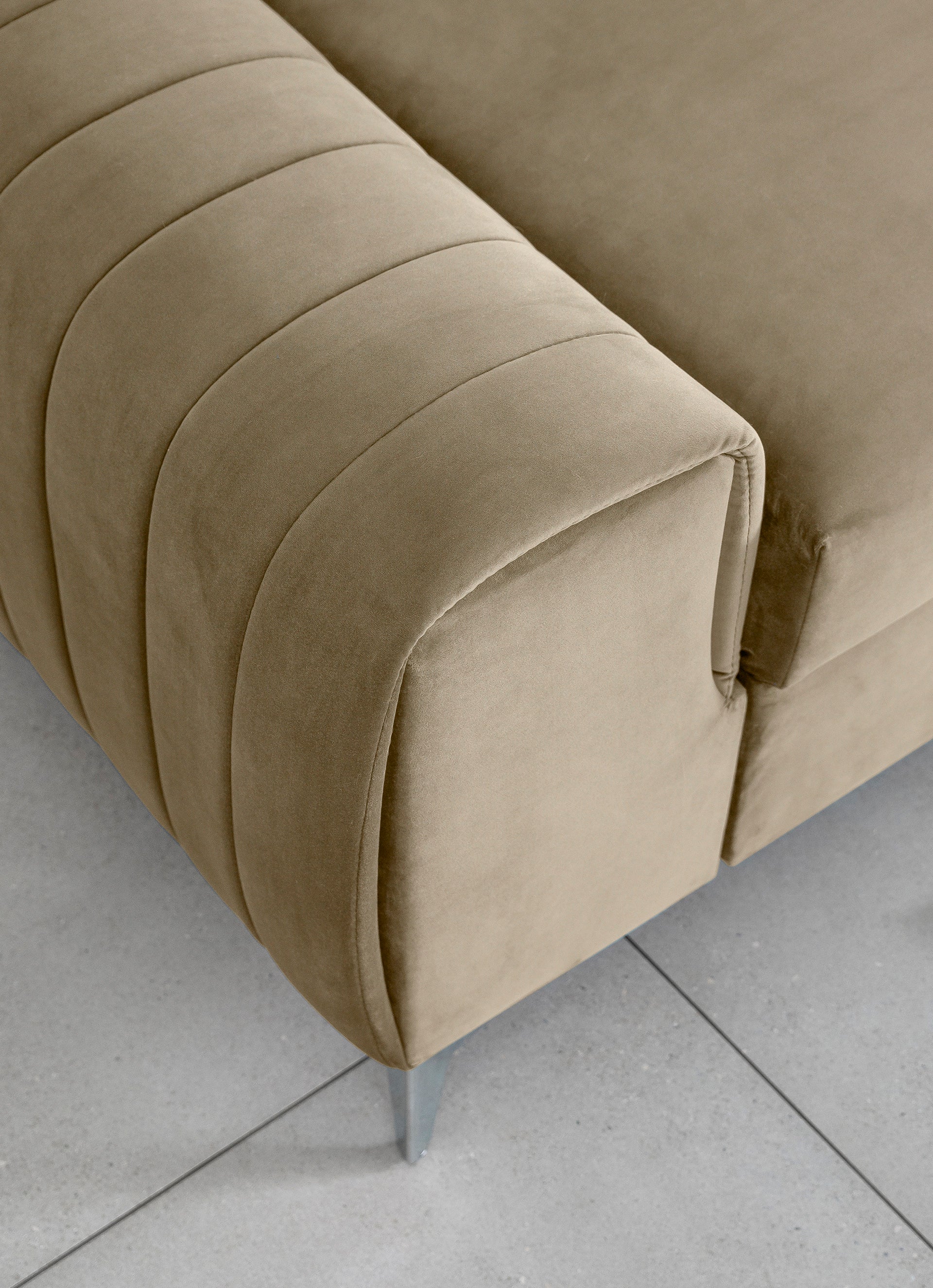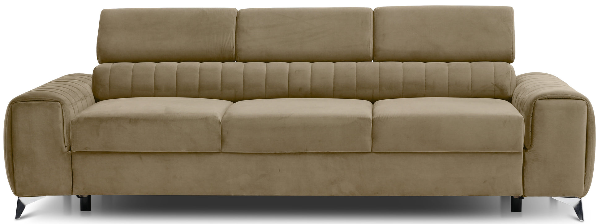 Kanapa Laurence ma solidną konstrukcję i drewnianą ramę, która opiera się na zwężających się, ukośnych, metalowych, chromowanych nogach, co zapewnia efekt glamour oraz klasycznego piękna z nutką nowoczesności. Otulona eleganckimi tkaninami z kolekcji ELTAP rozkładana sofa jest wypełniona piankami HR i T30, a także wspierana przez solidne sprężyny faliste typu B, które zapewniają optymalne poczucie komfortu. Kanapa Laurence wprowadza do wnętrza lekkość i elegancję. Klasyczną bryłę mebla przełamują przeszycia i wyraźnie podkreślony podział mebla na trzy miejsca w siedzisku. Wszystko to sprawia, że nasz mebel tapicerowany wygląda stylowo i elegancko bez względu na to, gdzie go postawisz. Z pewnością stanie się hitem zarówno wśród odwiedzających dom przyjaciół, jak i rodziny. Kanapa Laurence to idealny wybór do małych pomieszczeń, gdzie nie ma opcji wstawienia narożnika, ponieważ jej wymiary to: 261x97x75 centymetrów. Wysokość nóżek pozwala na sprzątanie pod kanapą nowoczesnymi robotami sprzątającymi, ponieważ wynosi 9 cm. Kolejnym świetnym pomysłem zastosowanym w kanapie Laurence jest funkcja trzech ruchomych zagłówków. Dzięki temu zabiegowi można komfortowo wypoczywać i nie martwić się o niewygodne ułożenie ciała. Ta kanapa z funkcją spania prezentuje się elegancko i estetycznie. Jej nowoczesny wygląd wprowadzi wspaniałe wrażenie i doda stylu Twojej przestrzeni życiowej.