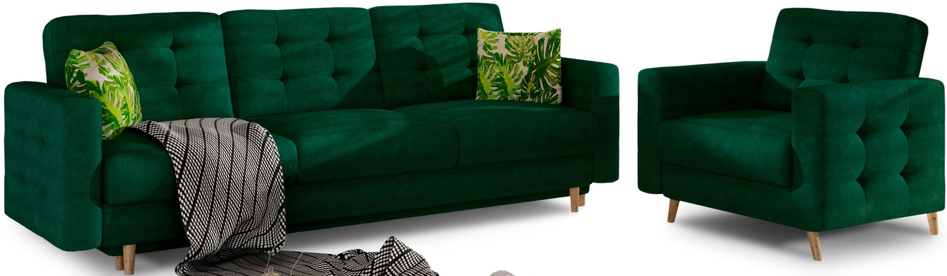 Komplet Asgard utrzymany jest w stylistyce pasującej zarówno do klimatu nowoczesnego, retro, loftowego, jak i skandynawskiego. Głębokie siedziska, wysokie oparcia i podłokietniki, stylowe, klasyczne drewniane nogi skośne oraz eleganckie pikowania - wszystko to sprawia, że zestaw ten wprowadzi do wnętrza salonu wyjątkowy klimat, zapewniając maksimum wygody podczas relaksu w domowym zaciszu. Jeśli chcesz, by salon w Twoim mieszkaniu zachęcał swoim wystrojem do relaksu, jesteś fanem eleganckich wnętrz z klimatem, zestaw Asgard jest kompletem wypoczynkowym, którego szukasz.