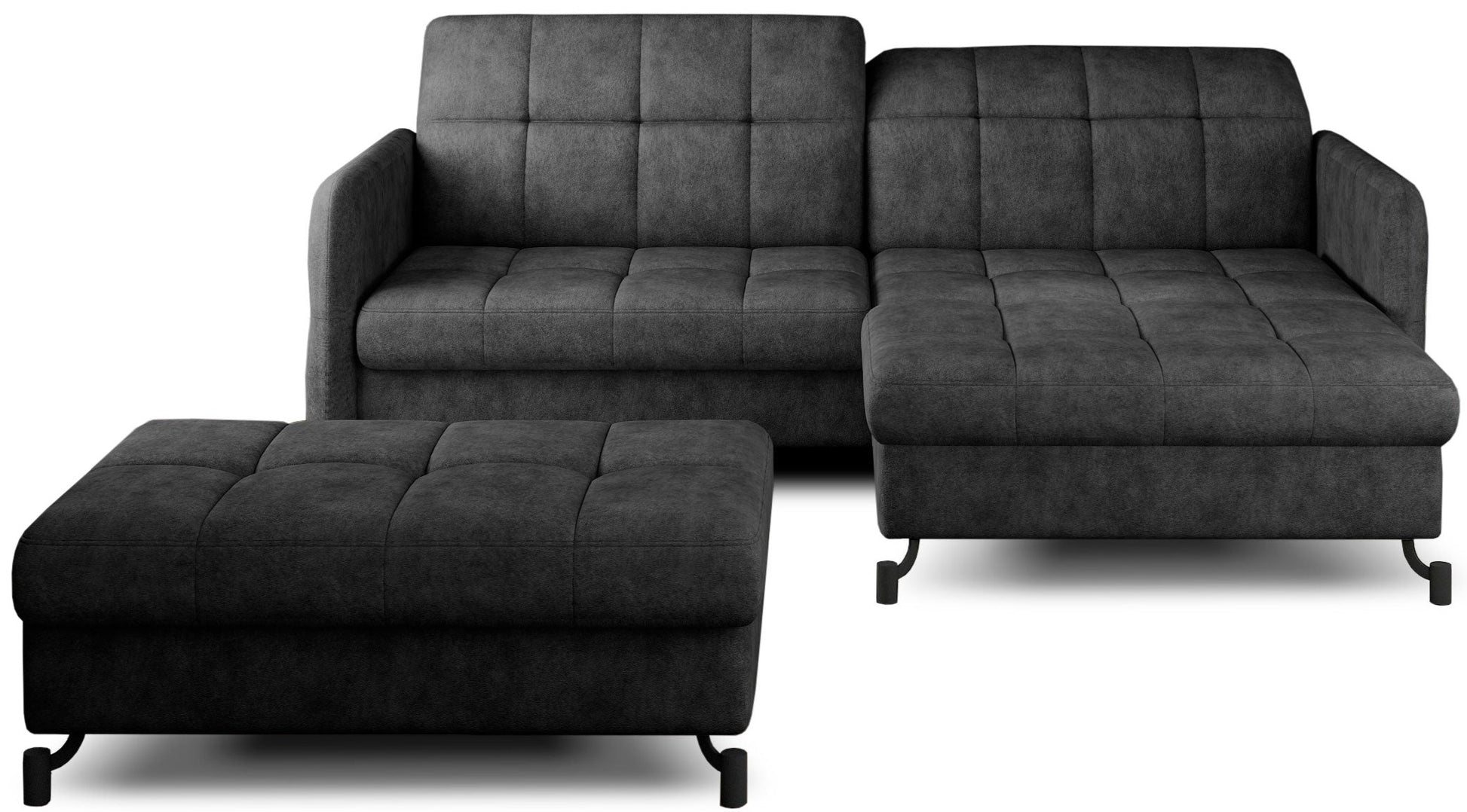 Zestaw Lorelle to rozwiązanie stworzone z myślą o osobach ceniących sobie możliwość szybkiego zbudowania zachwycającej aranżacji. Nasz komplet składa się bowiem z kompaktowego narożnika z funkcją spania oraz dopasowanej do niego pufy. Elegancka linia mebli wraz ze smukłymi, czarnymi nóżkami wykonanymi z metalu sprawiają, że produkty prezentują się niezwykle atrakcyjnie, jednocześnie zyskując wizualnej lekkości. Dodatkowo design ten sprawia, że Lorelle znakomicie wpisze się w wystrój przestrzeni zarówno nowoczesnych, jak i klasycznych. Bez problemu zbudujesz zatem swoje wymarzone wnętrze!