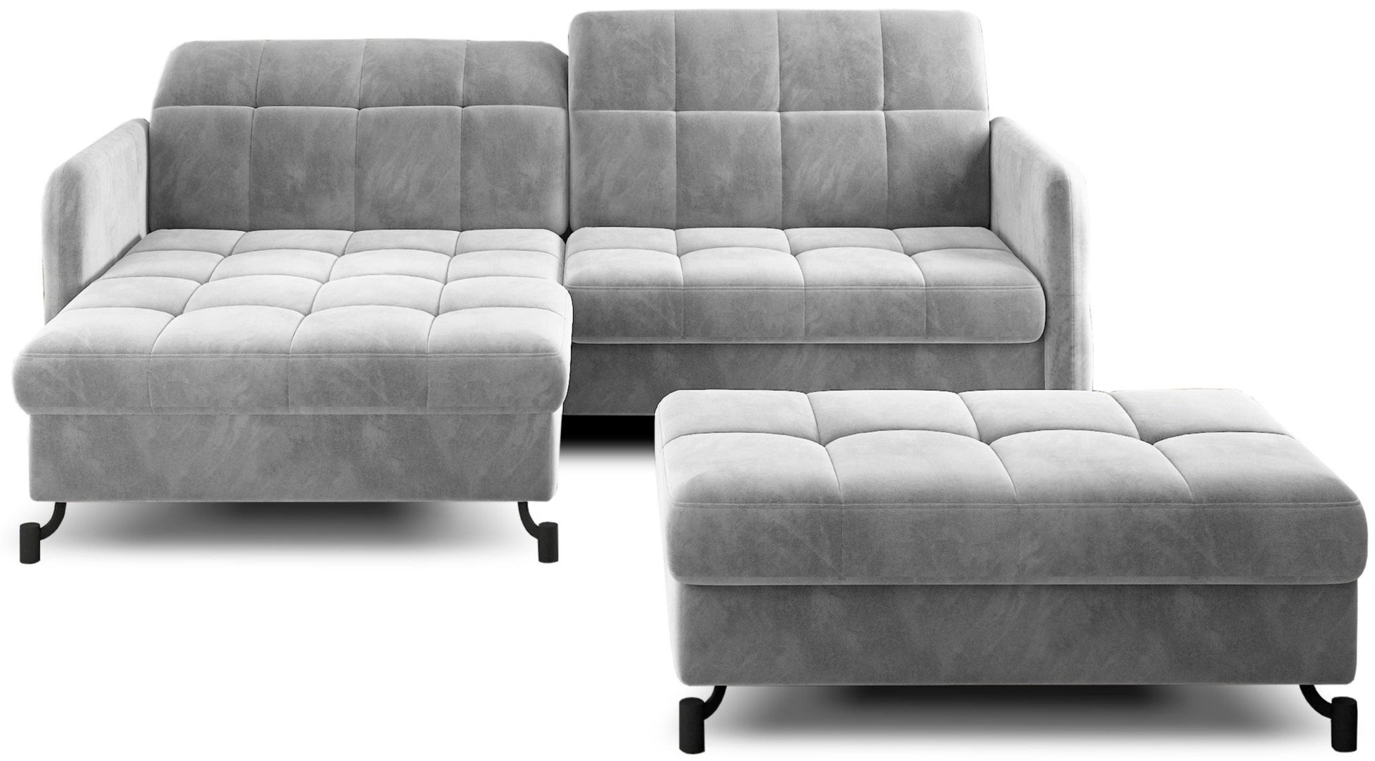 Zestaw Lorelle to rozwiązanie stworzone z myślą o osobach ceniących sobie możliwość szybkiego zbudowania zachwycającej aranżacji. Nasz komplet składa się bowiem z kompaktowego narożnika z funkcją spania oraz dopasowanej do niego pufy. Elegancka linia mebli wraz ze smukłymi, czarnymi nóżkami wykonanymi z metalu sprawiają, że produkty prezentują się niezwykle atrakcyjnie, jednocześnie zyskując wizualnej lekkości. Dodatkowo design ten sprawia, że Lorelle znakomicie wpisze się w wystrój przestrzeni zarówno nowoczesnych, jak i klasycznych. Bez problemu zbudujesz zatem swoje wymarzone wnętrze!