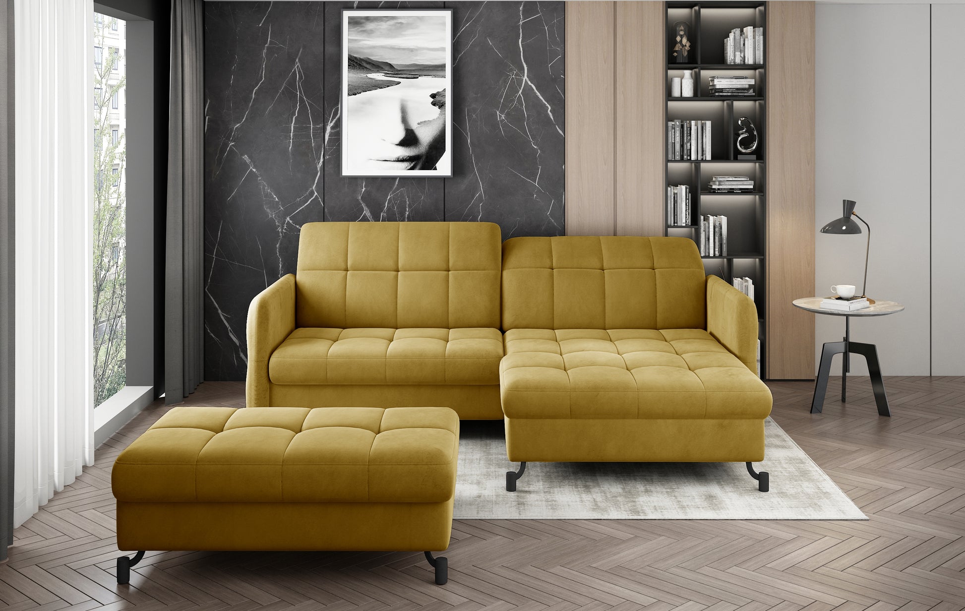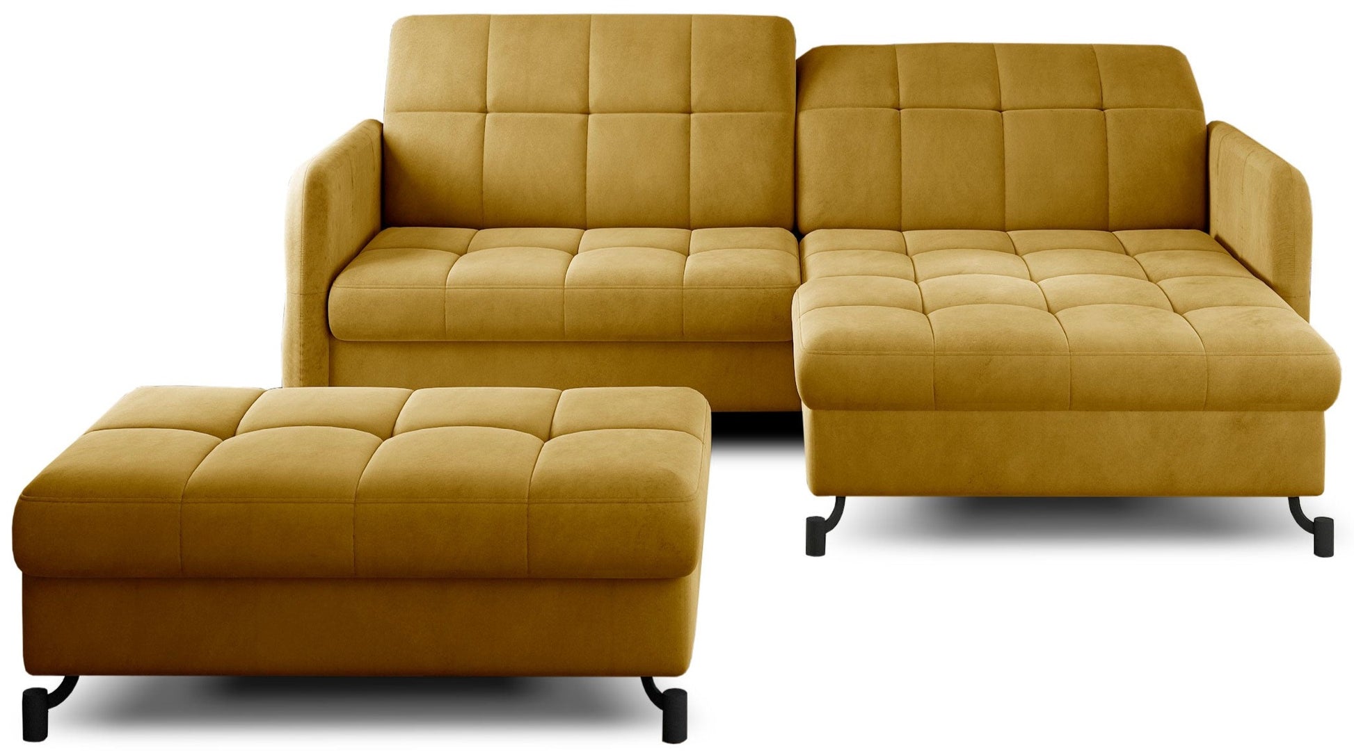 Zestaw Lorelle to rozwiązanie stworzone z myślą o osobach ceniących sobie możliwość szybkiego zbudowania zachwycającej aranżacji. Nasz komplet składa się bowiem z kompaktowego narożnika z funkcją spania oraz dopasowanej do niego pufy. Elegancka linia mebli wraz ze smukłymi, czarnymi nóżkami wykonanymi z metalu sprawiają, że produkty prezentują się niezwykle atrakcyjnie, jednocześnie zyskując wizualnej lekkości. Dodatkowo design ten sprawia, że Lorelle znakomicie wpisze się w wystrój przestrzeni zarówno nowoczesnych, jak i klasycznych. Bez problemu zbudujesz zatem swoje wymarzone wnętrze!