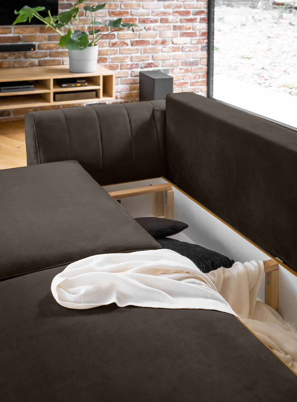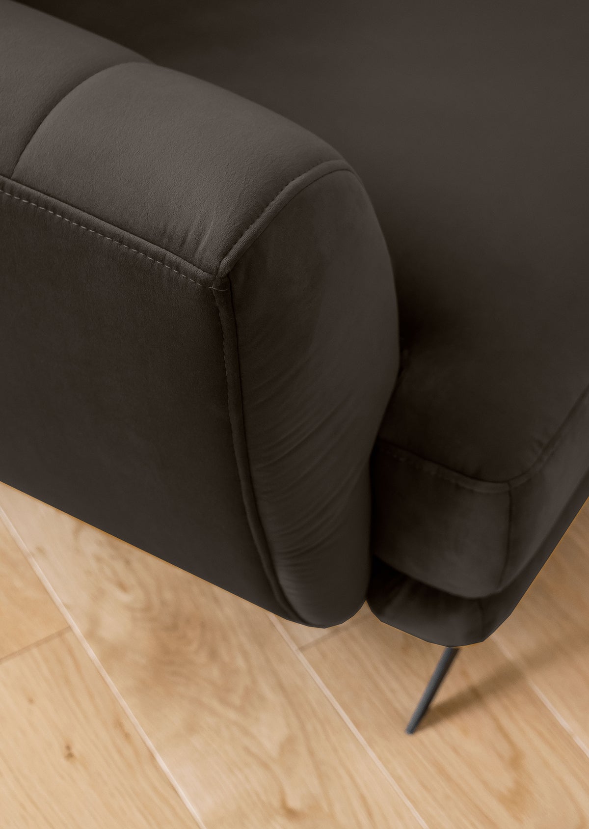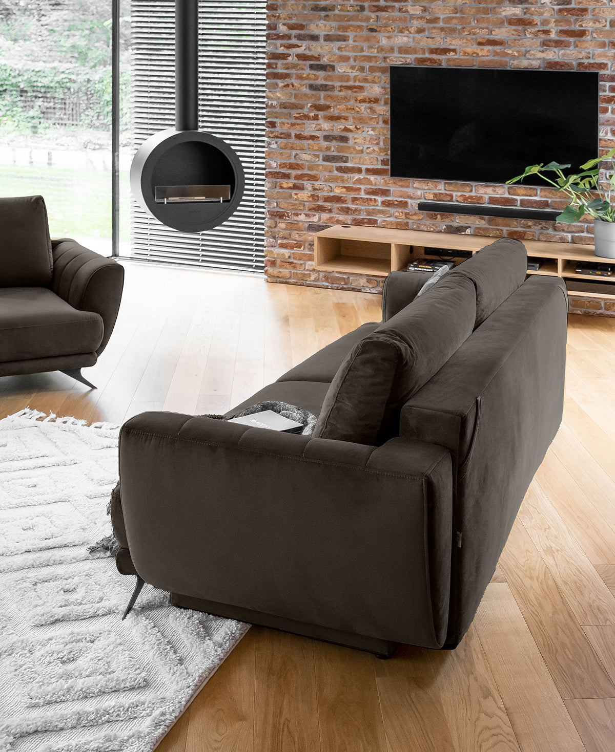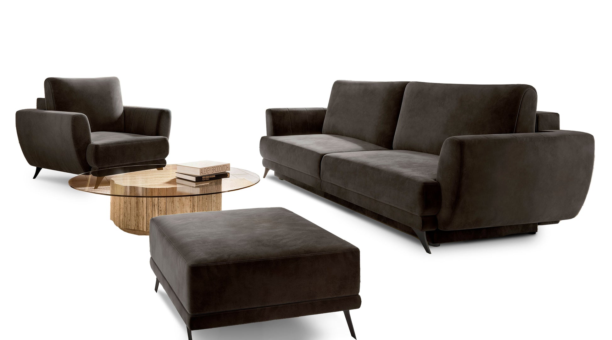 Meble wypoczynkowe Megis to bardzo praktyczny zestaw, w skład którego wchodzą: kanapa o wymiarach - 250 x 95 x 90 cm, fotel – 102 x 94 x 87 cm i puf - 82 x 68 x 42 cm. Meble te cechują się wysokim komfortem użytkowania, ponieważ ich siedziska wykonano z wysokoelastycznej pianki HR. Sprężyny faliste wewnątrz mebli również wpływają na ich poziom wygody i dają możliwość spokojnego wypoczynku. Nóżki kanapy, pufa i fotela to czarna stal o wysokości aż 13 centymetrów. Dzięki takiemu zabiegowi z łatwością można utrzymać czystość pod meblami. Prosta forma, wysokie podłokietniki o niestandardowym kształcie i delikatne przeszycia to cechy wyróżniające zestaw Megis. Prócz walorów wizualnych komplet mebli wypoczynkowych jest także funkcjonalny. Kanapę wyposażono w mechanizm rozkładania typu DL, dzięki czemu zyskujemy funkcję spania o powierzchni: 200 x 145 cm. Sofa posiada także pojemnik na pościel znajdujący się w skrzyni. Puf może posłużyć jako przedłużenie kanapy lub dodatkowe miejsce do siedzenia, a fotel przyniesie ukojenie w niedzielne, leniwe wieczory.