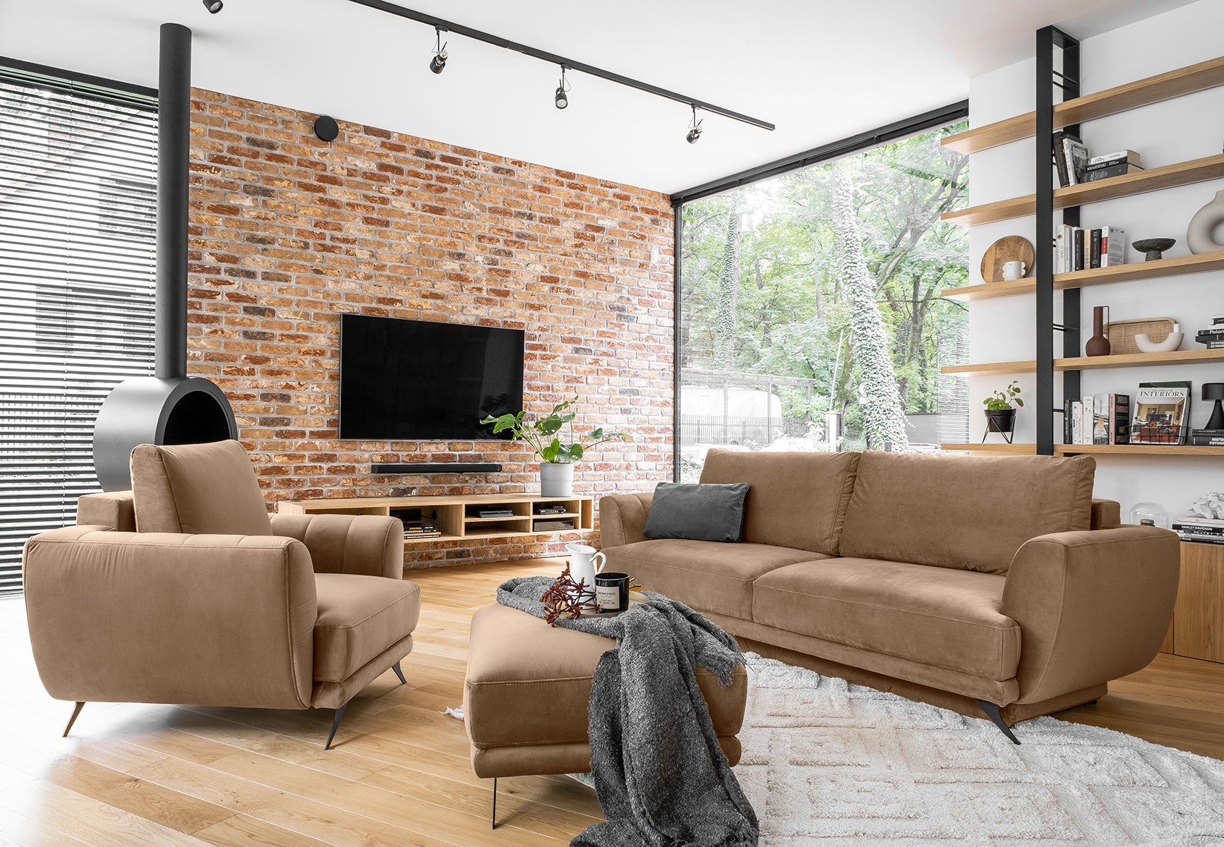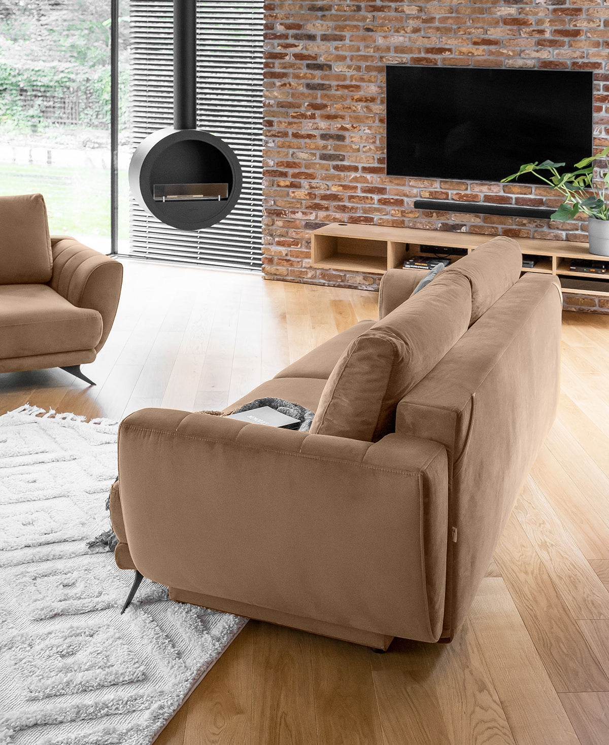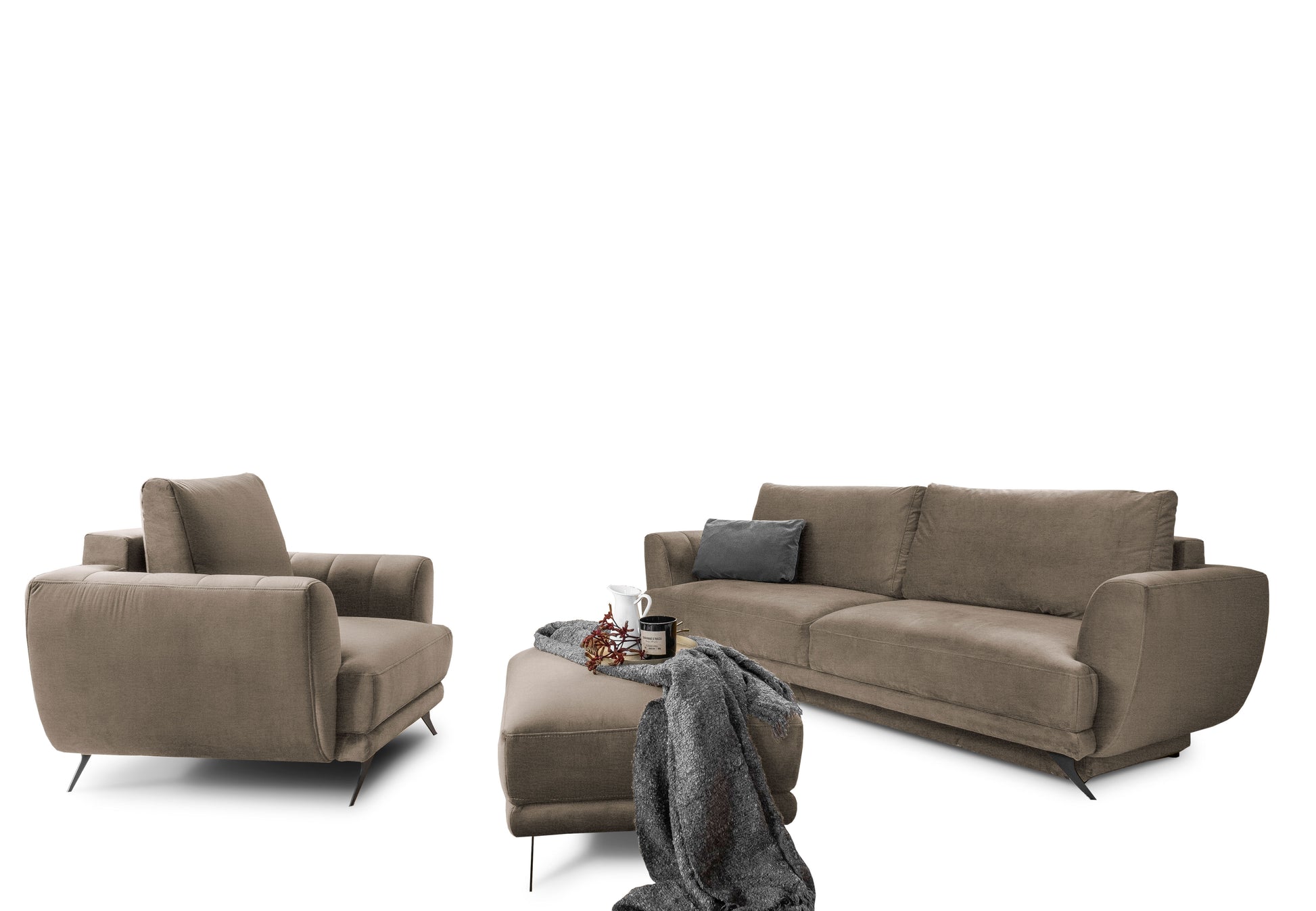 Meble wypoczynkowe Megis to bardzo praktyczny zestaw, w skład którego wchodzą: kanapa o wymiarach - 250 x 95 x 90 cm, fotel – 102 x 94 x 87 cm i puf - 82 x 68 x 42 cm. Meble te cechują się wysokim komfortem użytkowania, ponieważ ich siedziska wykonano z wysokoelastycznej pianki HR. Sprężyny faliste wewnątrz mebli również wpływają na ich poziom wygody i dają możliwość spokojnego wypoczynku. Nóżki kanapy, pufa i fotela to czarna stal o wysokości aż 13 centymetrów. Dzięki takiemu zabiegowi z łatwością można utrzymać czystość pod meblami. Prosta forma, wysokie podłokietniki o niestandardowym kształcie i delikatne przeszycia to cechy wyróżniające zestaw Megis. Prócz walorów wizualnych komplet mebli wypoczynkowych jest także funkcjonalny. Kanapę wyposażono w mechanizm rozkładania typu DL, dzięki czemu zyskujemy funkcję spania o powierzchni: 200 x 145 cm. Sofa posiada także pojemnik na pościel znajdujący się w skrzyni. Puf może posłużyć jako przedłużenie kanapy lub dodatkowe miejsce do siedzenia, a fotel przyniesie ukojenie w niedzielne, leniwe wieczory.