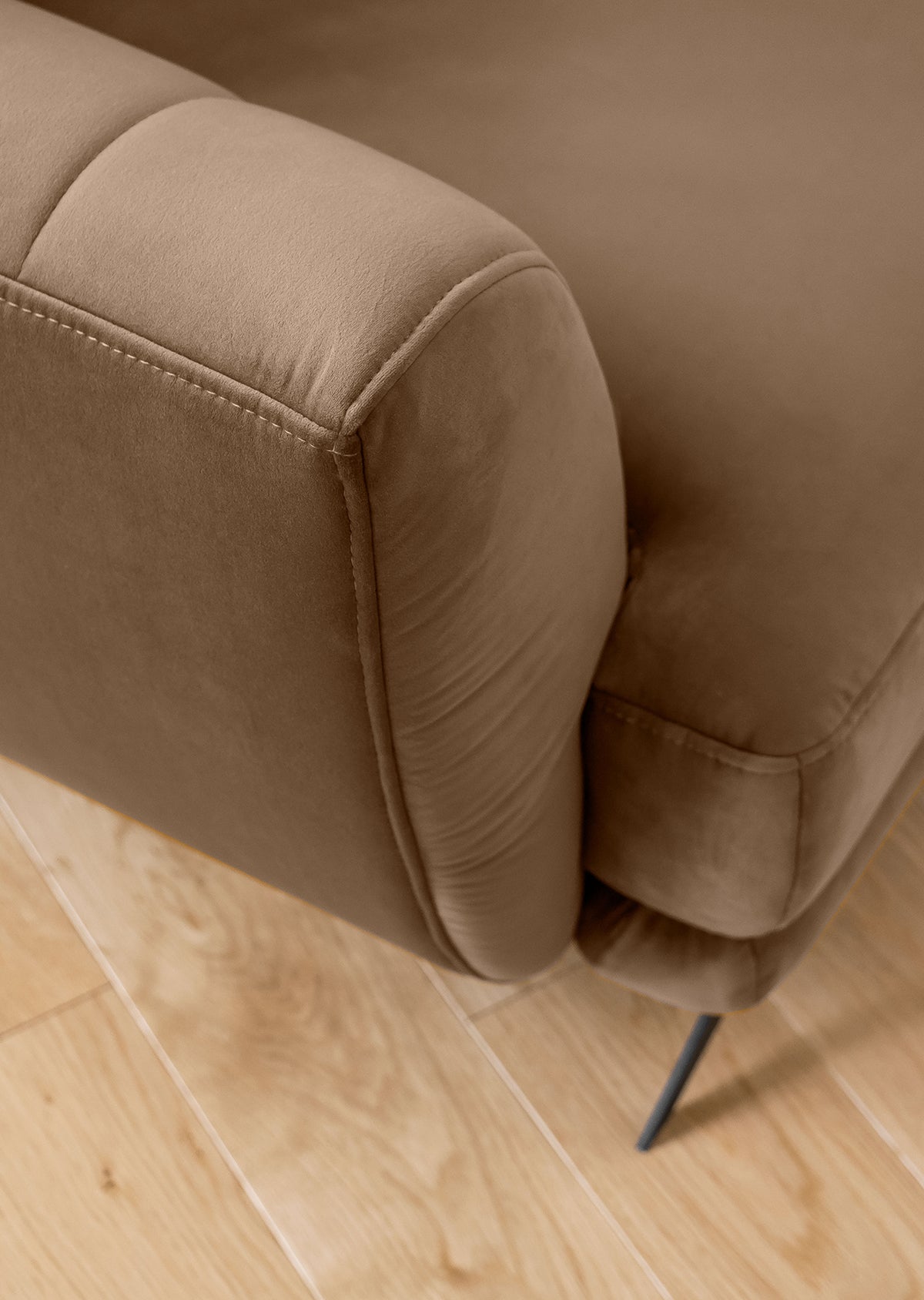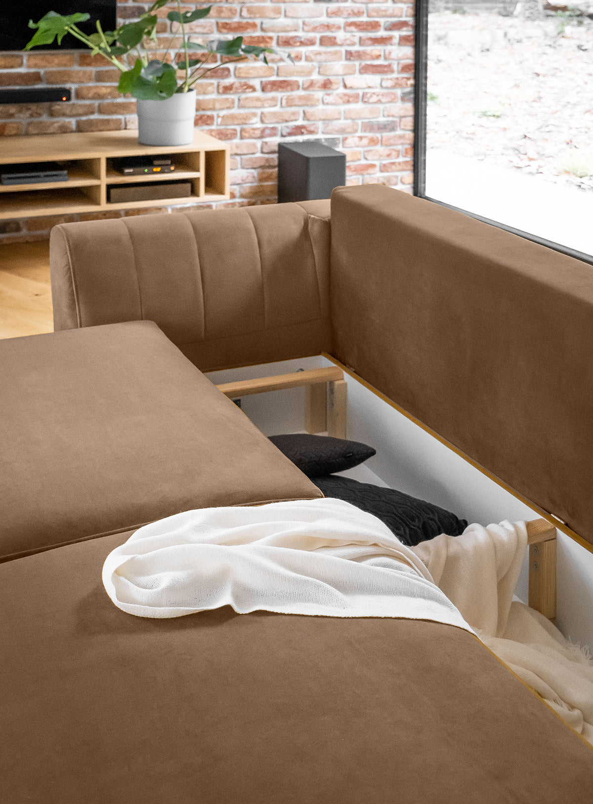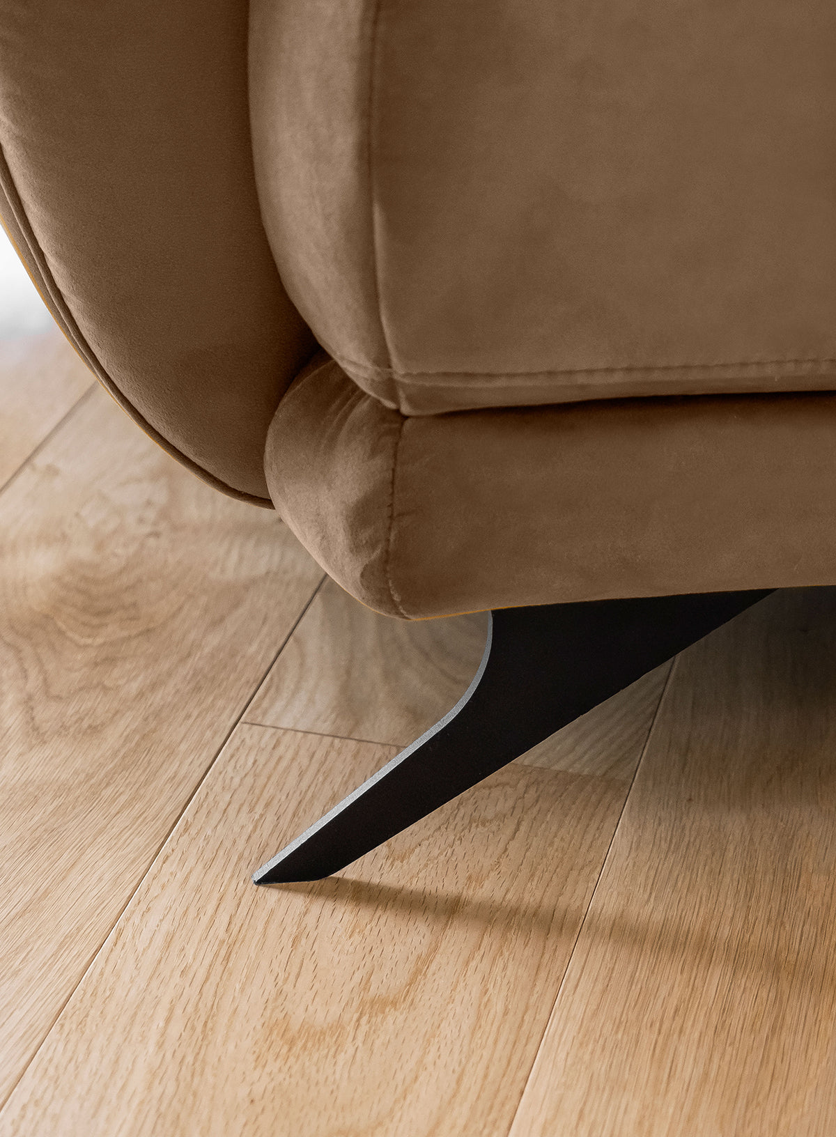 Meble wypoczynkowe Megis to bardzo praktyczny zestaw, w skład którego wchodzą: kanapa o wymiarach - 250 x 95 x 90 cm, fotel – 102 x 94 x 87 cm i puf - 82 x 68 x 42 cm. Meble te cechują się wysokim komfortem użytkowania, ponieważ ich siedziska wykonano z wysokoelastycznej pianki HR. Sprężyny faliste wewnątrz mebli również wpływają na ich poziom wygody i dają możliwość spokojnego wypoczynku. Nóżki kanapy, pufa i fotela to czarna stal o wysokości aż 13 centymetrów. Dzięki takiemu zabiegowi z łatwością można utrzymać czystość pod meblami. Prosta forma, wysokie podłokietniki o niestandardowym kształcie i delikatne przeszycia to cechy wyróżniające zestaw Megis. Prócz walorów wizualnych komplet mebli wypoczynkowych jest także funkcjonalny. Kanapę wyposażono w mechanizm rozkładania typu DL, dzięki czemu zyskujemy funkcję spania o powierzchni: 200 x 145 cm. Sofa posiada także pojemnik na pościel znajdujący się w skrzyni. Puf może posłużyć jako przedłużenie kanapy lub dodatkowe miejsce do siedzenia, a fotel przyniesie ukojenie w niedzielne, leniwe wieczory.