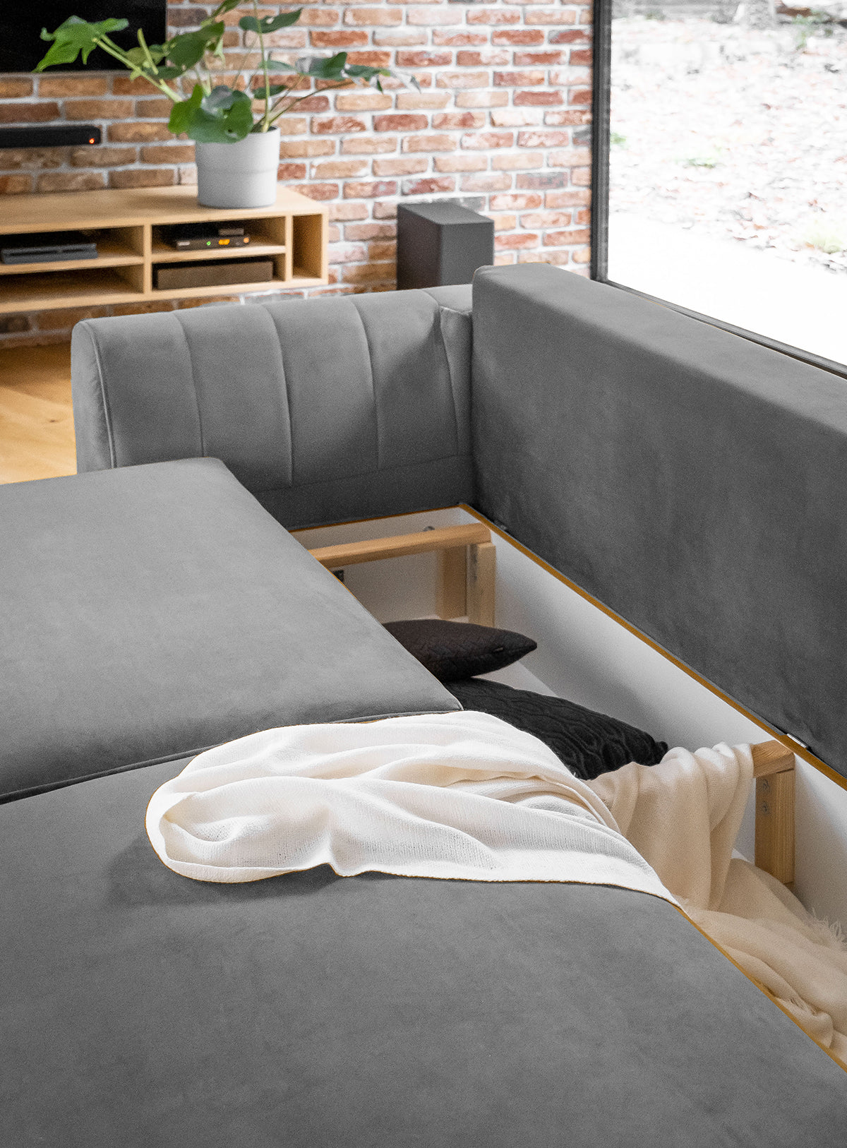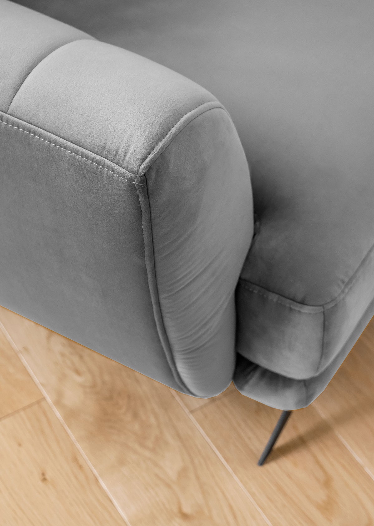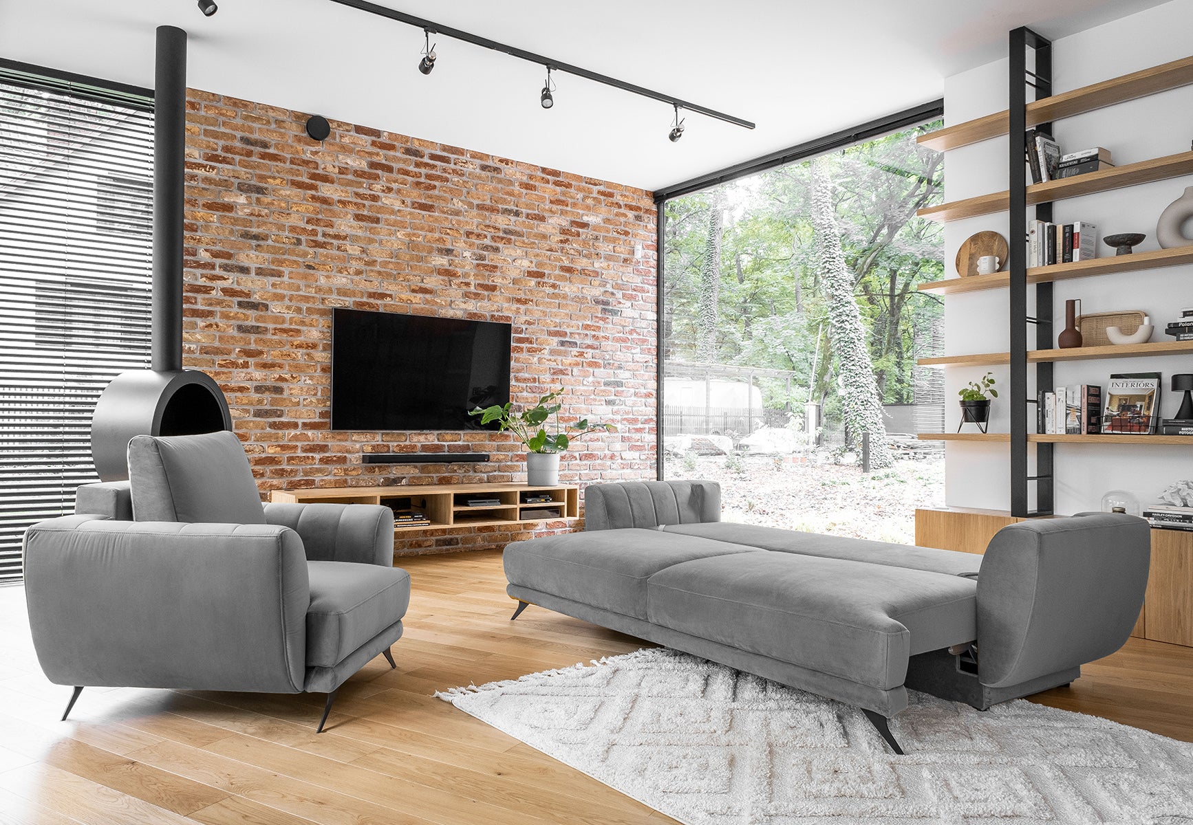 Meble wypoczynkowe Megis to bardzo praktyczny zestaw, w skład którego wchodzą: kanapa o wymiarach - 250 x 95 x 90 cm, fotel – 102 x 94 x 87 cm i puf - 82 x 68 x 42 cm. Meble te cechują się wysokim komfortem użytkowania, ponieważ ich siedziska wykonano z wysokoelastycznej pianki HR. Sprężyny faliste wewnątrz mebli również wpływają na ich poziom wygody i dają możliwość spokojnego wypoczynku. Nóżki kanapy, pufa i fotela to czarna stal o wysokości aż 13 centymetrów. Dzięki takiemu zabiegowi z łatwością można utrzymać czystość pod meblami. Prosta forma, wysokie podłokietniki o niestandardowym kształcie i delikatne przeszycia to cechy wyróżniające zestaw Megis. Prócz walorów wizualnych komplet mebli wypoczynkowych jest także funkcjonalny. Kanapę wyposażono w mechanizm rozkładania typu DL, dzięki czemu zyskujemy funkcję spania o powierzchni: 200 x 145 cm. Sofa posiada także pojemnik na pościel znajdujący się w skrzyni. Puf może posłużyć jako przedłużenie kanapy lub dodatkowe miejsce do siedzenia, a fotel przyniesie ukojenie w niedzielne, leniwe wieczory.