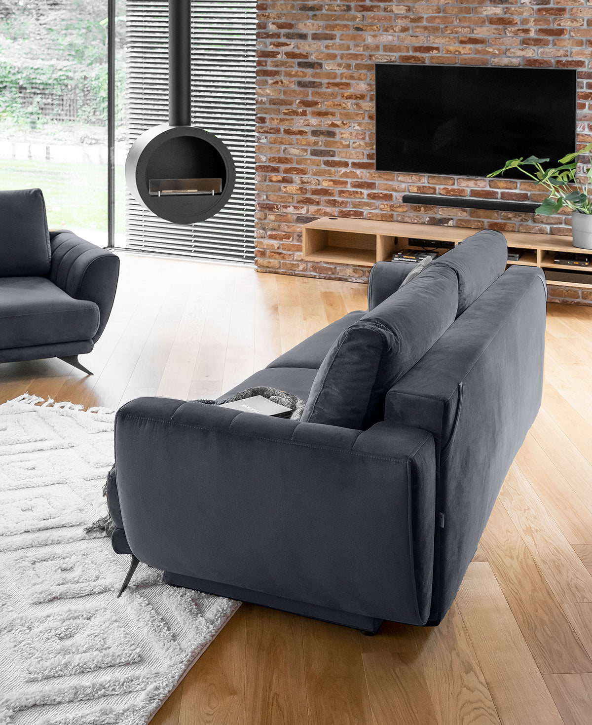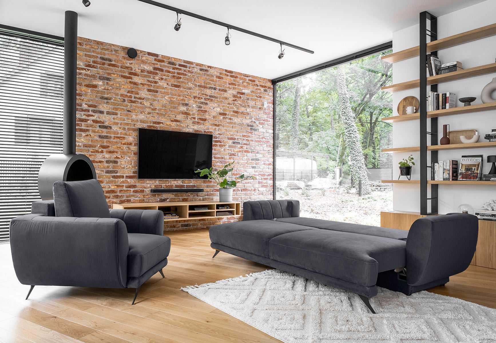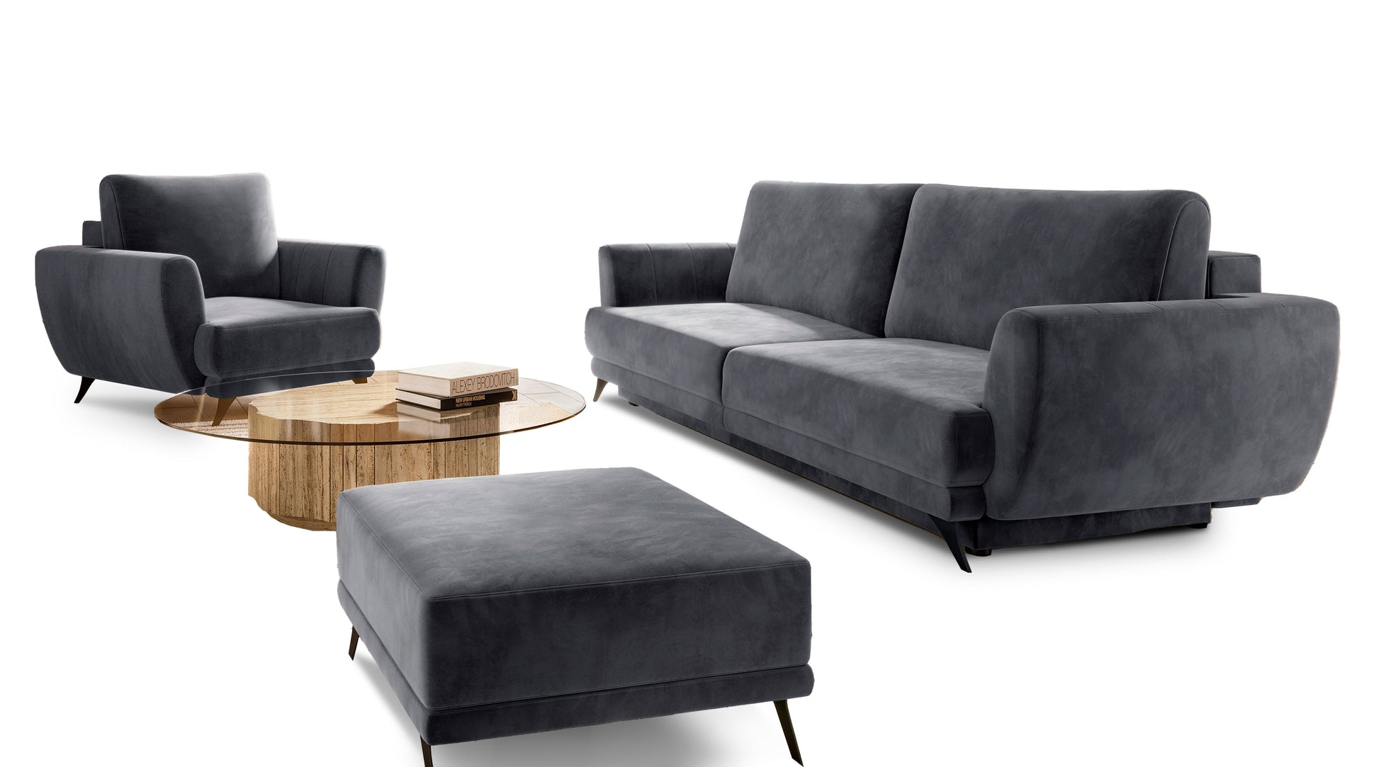 Meble wypoczynkowe Megis to bardzo praktyczny zestaw, w skład którego wchodzą: kanapa o wymiarach - 250 x 95 x 90 cm, fotel – 102 x 94 x 87 cm i puf - 82 x 68 x 42 cm. Meble te cechują się wysokim komfortem użytkowania, ponieważ ich siedziska wykonano z wysokoelastycznej pianki HR. Sprężyny faliste wewnątrz mebli również wpływają na ich poziom wygody i dają możliwość spokojnego wypoczynku. Nóżki kanapy, pufa i fotela to czarna stal o wysokości aż 13 centymetrów. Dzięki takiemu zabiegowi z łatwością można utrzymać czystość pod meblami. Prosta forma, wysokie podłokietniki o niestandardowym kształcie i delikatne przeszycia to cechy wyróżniające zestaw Megis. Prócz walorów wizualnych komplet mebli wypoczynkowych jest także funkcjonalny. Kanapę wyposażono w mechanizm rozkładania typu DL, dzięki czemu zyskujemy funkcję spania o powierzchni: 200 x 145 cm. Sofa posiada także pojemnik na pościel znajdujący się w skrzyni. Puf może posłużyć jako przedłużenie kanapy lub dodatkowe miejsce do siedzenia, a fotel przyniesie ukojenie w niedzielne, leniwe wieczory.
