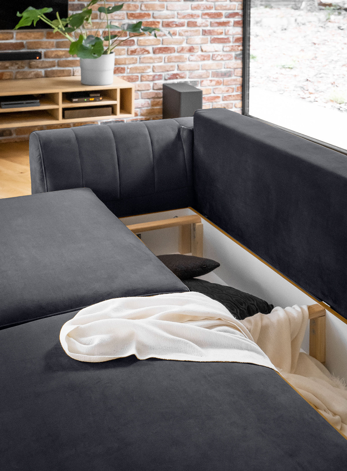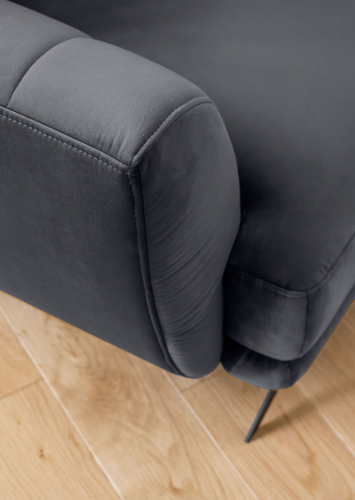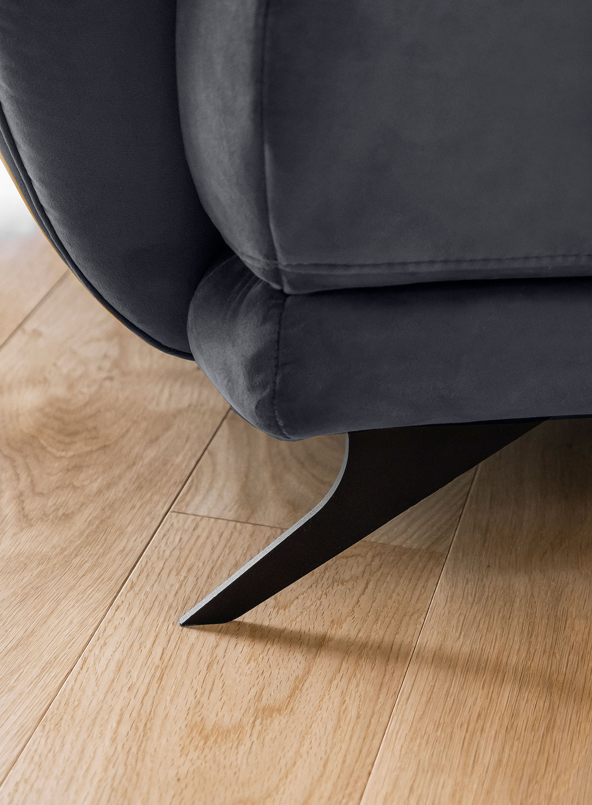 Meble wypoczynkowe Megis to bardzo praktyczny zestaw, w skład którego wchodzą: kanapa o wymiarach - 250 x 95 x 90 cm, fotel – 102 x 94 x 87 cm i puf - 82 x 68 x 42 cm. Meble te cechują się wysokim komfortem użytkowania, ponieważ ich siedziska wykonano z wysokoelastycznej pianki HR. Sprężyny faliste wewnątrz mebli również wpływają na ich poziom wygody i dają możliwość spokojnego wypoczynku. Nóżki kanapy, pufa i fotela to czarna stal o wysokości aż 13 centymetrów. Dzięki takiemu zabiegowi z łatwością można utrzymać czystość pod meblami. Prosta forma, wysokie podłokietniki o niestandardowym kształcie i delikatne przeszycia to cechy wyróżniające zestaw Megis. Prócz walorów wizualnych komplet mebli wypoczynkowych jest także funkcjonalny. Kanapę wyposażono w mechanizm rozkładania typu DL, dzięki czemu zyskujemy funkcję spania o powierzchni: 200 x 145 cm. Sofa posiada także pojemnik na pościel znajdujący się w skrzyni. Puf może posłużyć jako przedłużenie kanapy lub dodatkowe miejsce do siedzenia, a fotel przyniesie ukojenie w niedzielne, leniwe wieczory.