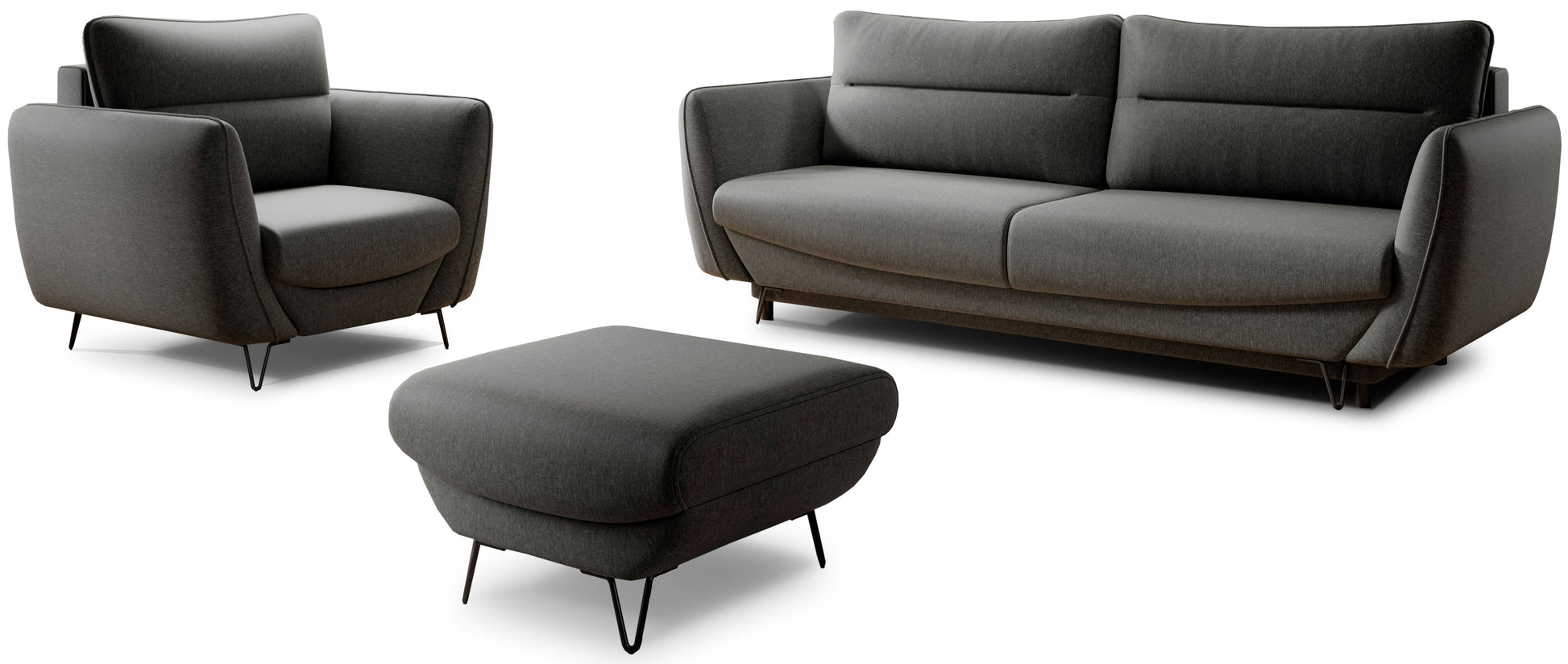 Zapewniamy zestaw wypoczynkowy, który stanowi idealne połączenie stylu, wygody i funkcjonalności. Komplet Silva to świetny wybór zarówno do mniejszych pomieszczeń, jak i do dużych wnętrz. Dzięki odpowiedniej konstrukcji meble są minimalistyczne, ale bardzo komfortowe. Wymiary sofy: 236 x 95 x 90 cm, fotela: 93 x 95 x 82 cm, i pufa: 67 x 67 x 42 cm - czyż nie są idealne? Jakby tego było mało, to sofa posiada funkcję spania o powierzchni: 200 x 145 cm. Zdaje się, że to świetne rozwiązanie w przypadku zapotrzebowania na dodatkowe łóżko. Poza tym mechanizm rozkładania DL sprawia, że zamiana sofy w miejsce do spania staje się intuicyjne i dziecinnie proste. Jeśli szukasz jeszcze czegoś w idealnych meblach, to z pewnością jest to pojemnik na pościel. I sofa Silva też go posiada, a przy tym zapewnia miejsce, by przechowywać poduszki, kołdry lub inne tekstylia. To wszystko sprawia, że nasz zestaw Silva jest świetnym wyborem, by miło spędzać czas. Jeśli potrzebujesz chwili relaksu, dobrze trafiłeś - usiądź i odpocznij.