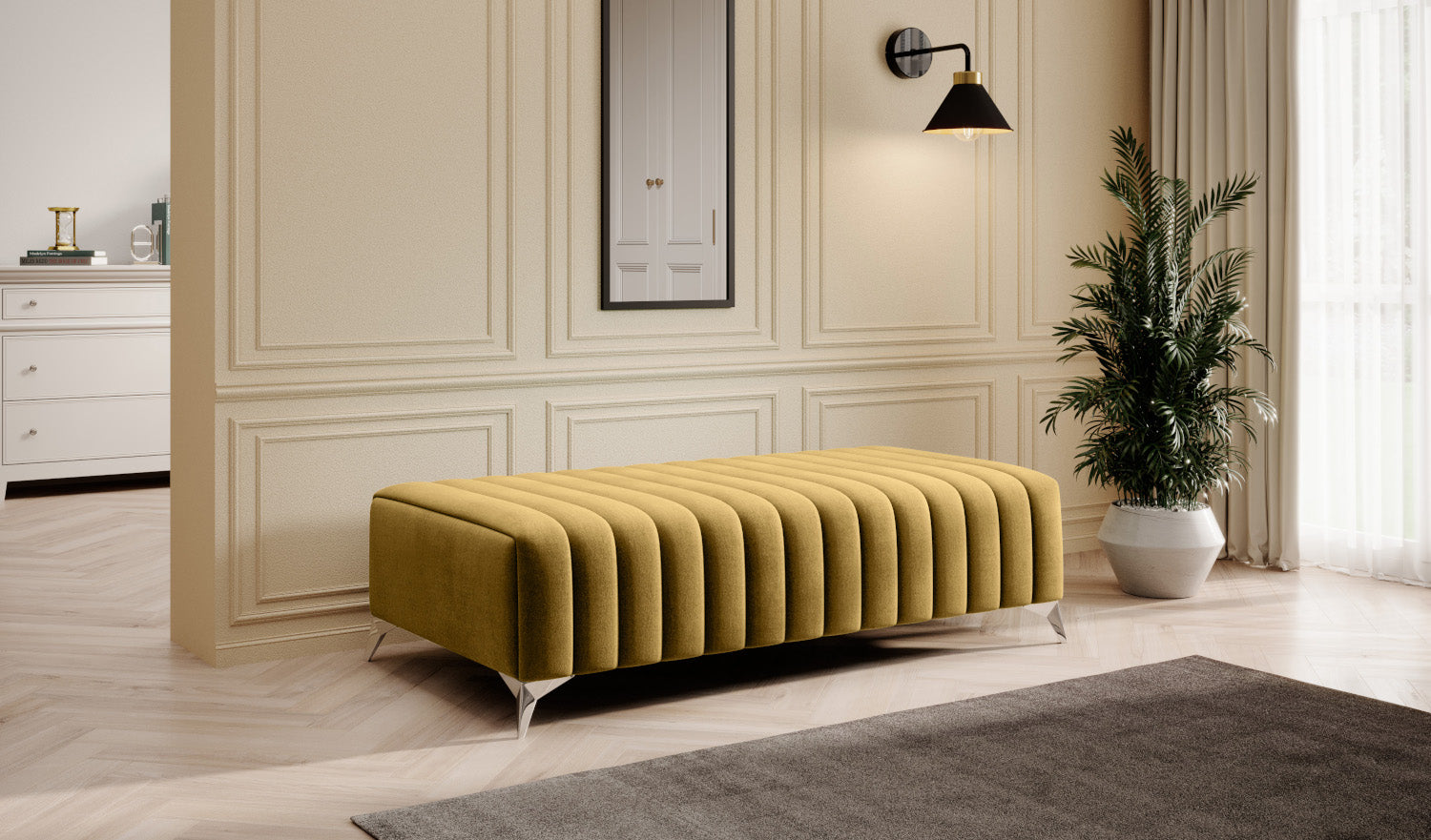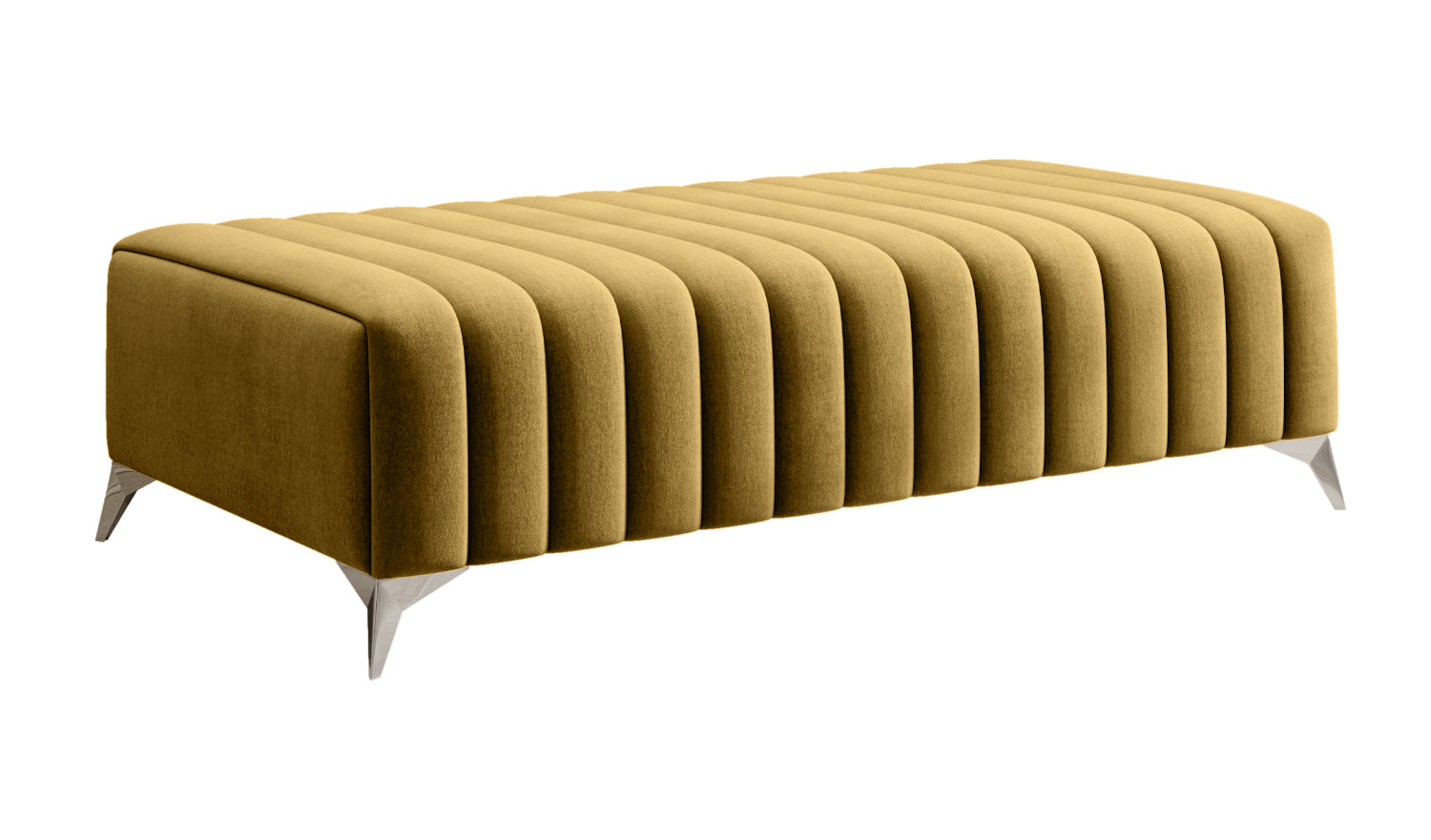 Pufa Laurence posiada także solidne nóżki o wysokości 9 cm wykonane ze stali chromowanej. To zarówno estetyczny dodatek, jak i sposób na zapewnienie całości należytej stabilności.